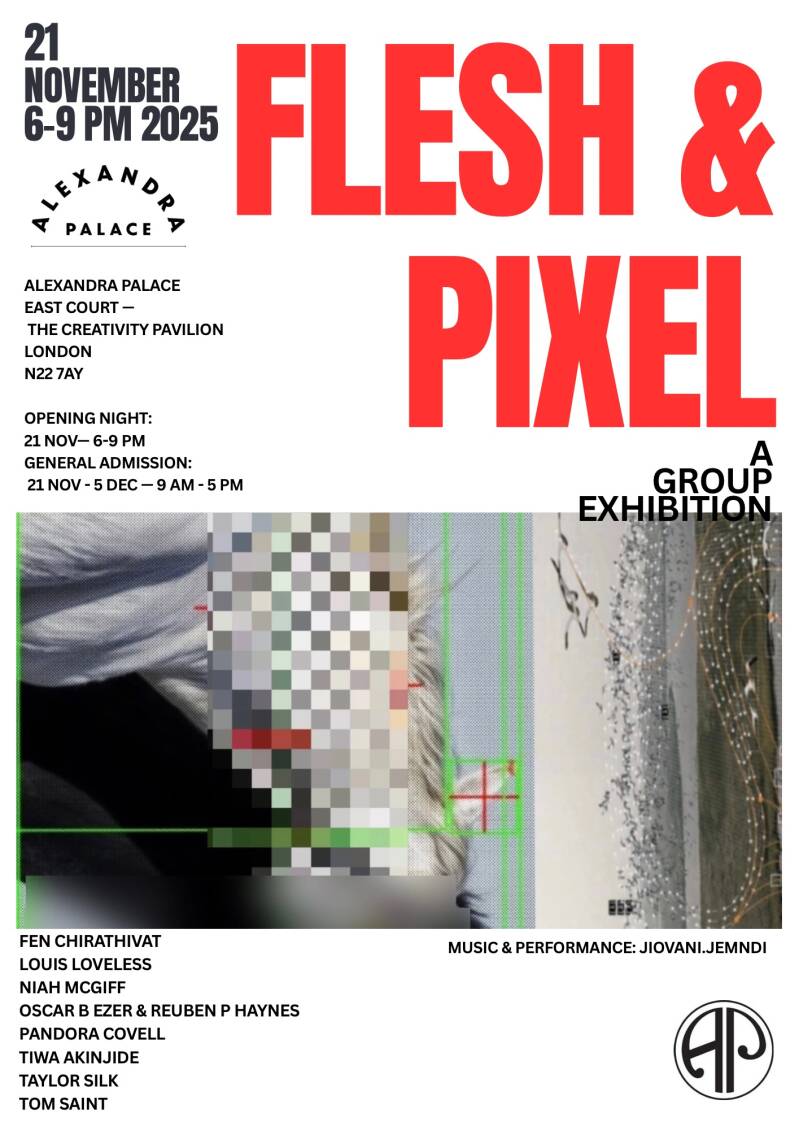Flesh & Pixel was an exhibition curated and organised by Niah McGiff, held in the East Court of Alexandra Palace. Bringing together nine artists working across painting, film, sculpture, and textiles, the exhibition presents a wide range of practices, from filmmaking to textile-based work.